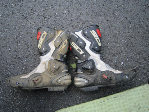 15:14 ブーツは バイクの下敷きになった左足の方は、思いっきり砂まみれ。(笑) パッド類も、結構削れちゃいました。(T_T) 最近少々くたびれてきたので、『ちょうど新しいの欲しかったの!』 と言うのはナイショの話だ。(笑) とりあえず、くっついた土を落とすため、水洗いして、陰干ししておく。 |