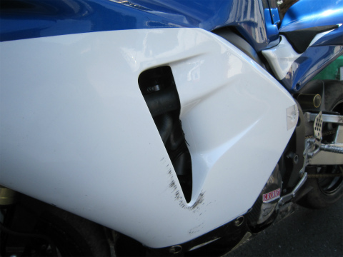 15:29 アッパーカウル 意外にも、アッパーカウルはほとんど破損箇所なし。 ラジエータの熱を逃がすダクトの下のところに、擦り傷がある程度。 「よかった。」 これは、コンパウンドで軽くこすっておけば、OKかな。 |