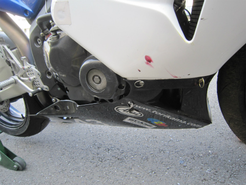 15:30 アンダーカウルが 右側は、YOU TUBEの画像を確認すると他のバイクをなぎ倒したみたいなので、カウルには他のバイクのペイントが・・・。(汗) そして、アンダーカウルの”Arai”のステッカーのところは穴が開いてしまいました。 (;。;) |