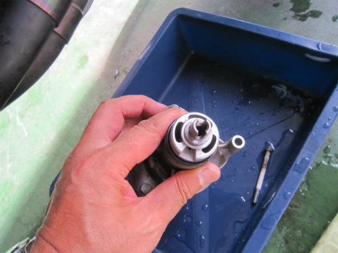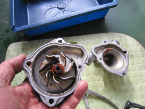 17:00 勢い付いて ウォーターポンプを手で回してみたら、自分が思っていたよりも重い。 「おかしいかな?」 と思って、ウォーターポンプも勢い付いて、ばらして見ました。(汗) 羽根の形状は複雑怪奇ですが、構造は至って簡単。 真ん中の羽根は、ボルトが埋め込まれているので、ばらせそうもありません。 こんなにスムーズに回らないものかわからないので、國川くんのメカニックの清水さんに電話で聞いてみたら、 「オイル側と冷却水側を遮断するのに、メカニカルシールになっているので、ある程度の回り難さはある」とのこと。 手で回してみて、偏心や回転に引っかかりがあるわけでもないので、これで良品として、組み直すことにします。 |