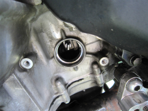 16:47 エンジン側 ドリブンスプロケットの下に、ウォーターポンプの動力の取り出し口がありました。 意外に簡単な構造。 このあたりも、オイル漏れの形跡はなし。 |