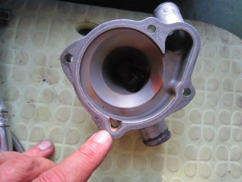 16:39 ウォーターパイプ ウォーターポンプから出ているアウト側のウォーターパイプ。 外してみると、しっかりと穴が! たぶん、隣のパイプのホースバンドが押しつけられて、切れちゃったかな。 |
