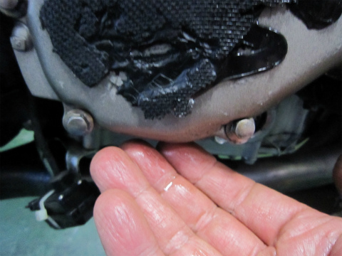 19:05 右側 ふと、我に帰ってクラッチカバーのオイル漏れ修理。 クラッチカバーとエンジンとのつなぎ目を指でなぞると、オイルが着いてくる。 間違いなく、漏れてますね。 漏れている箇所が、ここだけなら良いんですが・・・。 |