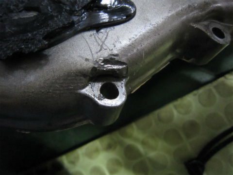 19:22 叩く 仕様がないので、クラッチカバーのボルトの周りをタガネで叩いて、ようやくオープンエンドレンチが入るように。 そして、ボルトを外すと・・・・。 クラッチカバーのボルトを取り付けて部分が内側に入る形で歪んでる。 \(>_<)/ |