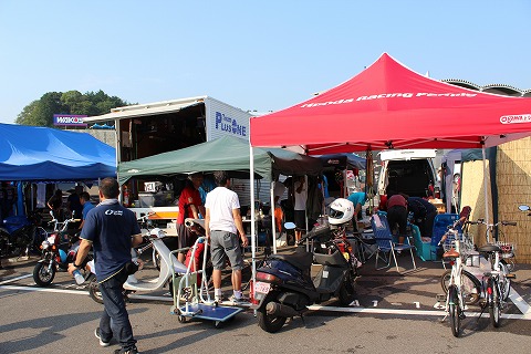 7:30 パドックに到着 パドックに到着! 4時間耐久のピットクルーパスだとモータースポーツゲートからスクーター(2輪車)で出入りすることができるので、そのままパドックまで乗り付け。 場内が広い鈴鹿サーキットではスクーターは重宝しますね。 |