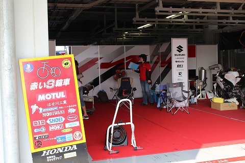 7:42 ピットを間借り 使用するピットは、事前に希望を申請もできますが、今回は希望を出さなかったので鈴鹿サーキット側が割り振り。 ”赤い三輪車”はSUZUKI系のチーム HMFのピットを間借り。 |