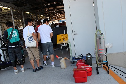 8:15 ピットへ マシンがパドックから出たら、最後の工具などを持ってピットに移動。 ピット裏には、耐久ならではのクイックチャージャーを準備。 ここで、毎回ピットストップ時に給油するガソリンを計ってチャージャーに準備します。 |