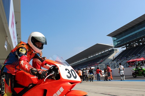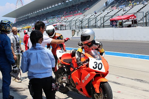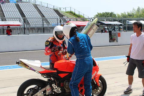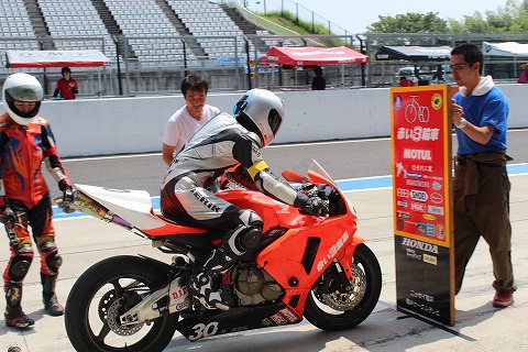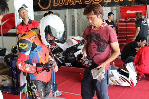 9:37 ライダー交代1回目 レースが開始され、まもなく40分になります。 今の4時間耐久レースのレギュレーションでは、1度に17周以上走ってはいけないルールです。 ”赤い3輪車”は1回目のピットインは16周回で行う作戦。 そして、まもなく1回目のライダー交代。 第2ライダーがライディングの準備を進めます。 |