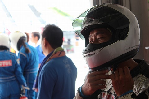 10:16 準備完了 2回目のライダー交代の時間が近づいてきました。 休憩していた第1ライダーは、装備を付けヘルメットを被りライディングの準備を完了。 |