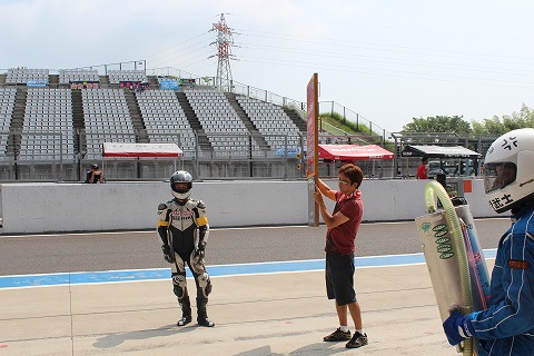 9:38 ピットインを待つ 第2ライダーが準備を終え、マシンがピットインしてくるのを待ちます。 そしてストップボードが、ピットインしてくるライダーにピットの停止位置を教えます。 |