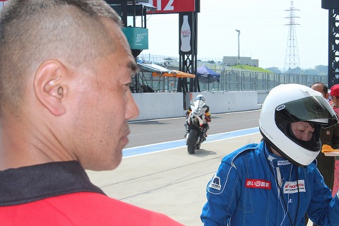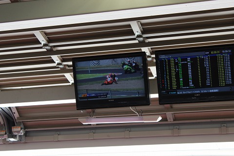 10:40 黙々と 転倒の光景がモニターに映し出され、ピットに戻ってこられそうなことを確認。 第2ライダーは黙々とライディングの準備を始めています。 |