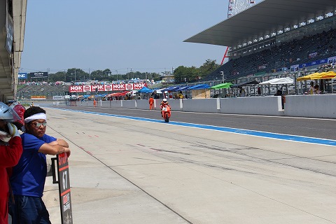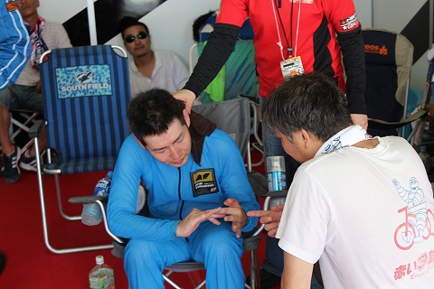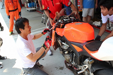 11:25 まもなく 転倒の影響により、42周目には一時44位まで順位を落としながらも、追い上げ走行中。 まもなく前回のピットインから16周を消化し、4回目のピットイン。 第1ライダーはライディングの準備をします。 転倒で痛めた指が少し気になるようです。 |