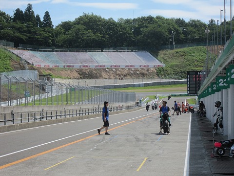 10:00 準備中 ピットでは、走行の準備が完了。 國川くんはつなぎに着替えて走行の準備中。 東北宮城県の少し高いところにあるSUGOですが、流石に8月の中旬だと暑いですね。 ピットのみんなは首からタオルを下げて作業中。 毎年レースウィークの8月下旬になると、少し涼しくなる記憶があるんですが、来週のレースウィークには涼しくなるのかな。 |
