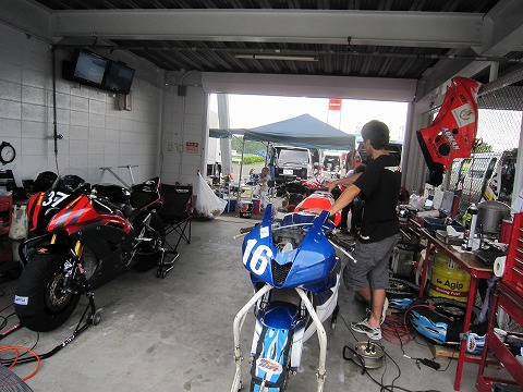 13:10 走行10分前 今日の走行2本目は13時20分から40分間。 走行まで10分となりました。 ライダーは着替えで準備中。 とりあえず、ゼッケン#16貼りました。(笑) |