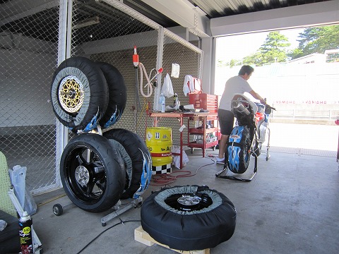 8:17 走行準備 昨日、走行してライディングにはケガはほとんど問題なさそう。 今日は、来週のレースに向けタイヤの選定とセッティングを進めます。 で、タイヤラックにはタイヤウォーマーをかけたタイヤだらけ。 これから色々試すんです。 (^_^)v |