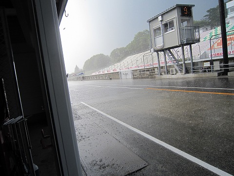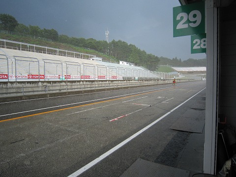 15:20 緊急ピットイン 今日の練習走行は40分が3本。 今日3本目の走行は14時50分から。 走行開始して10分ほどして、空には雷が鳴り始め、15時10分を過ぎる頃に、雨がポツポツと落ちてきました。 雨が落ち始めた時点で國川くんは緊急ピットイン。 |