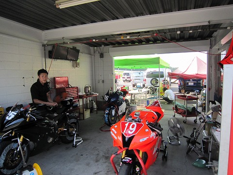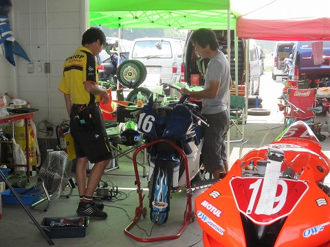 7:55 一段落 清水メカが到着して、ハイエースからバイクや工具類を降ろしてバタバタと準備。 途中の写真は歯抜けです。 (^_^;) とりあえず、走行1時間半前に準備ができて一段落。 |