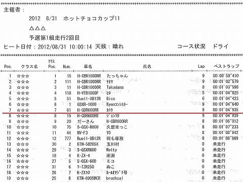 レースのグリッド タイムトライアルが終わって、グリッドが決まりました。 自分は1分4秒422で、グリッド7番手。 やっぱりいつもの4秒中盤。 体内時計で走るタイプです。(汗) 毎回同じ位置でブレーキングして、バンクして、同じところでアクセルを開けて走れば、タイムなんて変わるもんじゃ無い。 これで、タイムが縮まったら、まさにミステリーだね。(笑) そして同じマシンで走った國川くんは、1分0秒650 でグリッド2番手。 0秒で走れるマシンなんだね。 国際A級が乗ると。 トップのライダーは、59秒410。 CBR1000でスリック履いているけど、速いね。 |