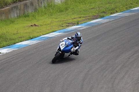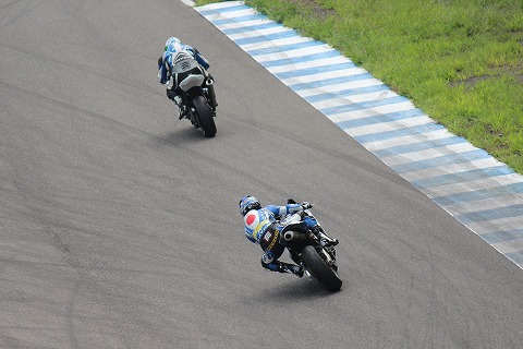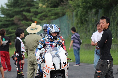 11:55 タイムトライアル 自分の予選の合計タイムは8番目だったので、スーパーポールでタイムトライアル。 國川くんも2番手だったかな。 最後から2番目にスーパーポールでタイムトライアル中。 伏せ方一つでも、自分たちノービスとは違って、きっちりカウルの中に入ってコンパクトだね。 自分の場合は、お腹がつかえて、タンクにペターって伏せらんないだよね。(爆) |