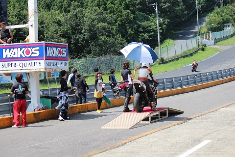 14:34 コースイン 14:時30分からは速いほうのスペシャルクラスのレース、第1ヒートが開始されます。 國川くんはKTMのRC8Rを借りて出走。 ピットロードで準備を終え、コースインをします。 |