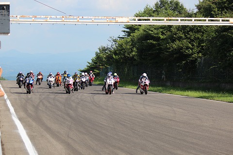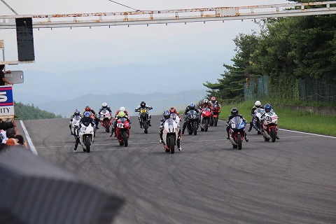 14:45 ホールショット ホールショットを奪ったのは國川くん。 まあ、トルクのある1200ccのツインだし、街乗り用だからギヤ比も低いしね。と辛めのコメント。(笑) |
