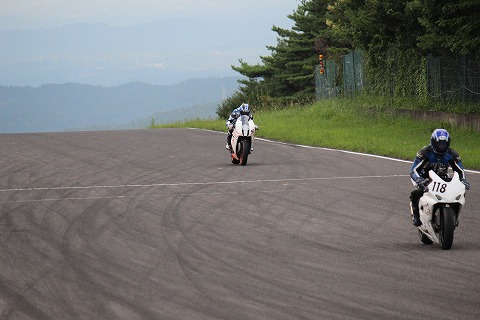 9:34 第1ヘアピン 自分の走行枠は 9:15〜9:30 と 10:00〜10:15の15分×2本 その空いている間に、國川くんがライディング。 写真は1ヘアピンのクリップあたり。 上の写真が國川くんで、下が自分。 と書かなくてもわかるよね。(笑) 真似した訳じゃ無いけど、つなぎヘルメットともこの距離で見ると似てる。 でもライディングは似てないね。(笑) ライディングは流石国際A級、ポット乗ったにもかかわらず、タイヤをピッタリと舗装と縁石の間に載せてる。 (タイヤに目が付いているのか?) 10:06 それに引き替え、思いっきりインを開けてる(開いている)自分。 まるで、「インから抜いて!」と言わんばかりだ。(爆) そして、國川くんと比べて自分はヘルメットがでかい! 実際はサイズは同じ”M”なんですけど、体がインに入っていない分、大きく見えるんだね。 |