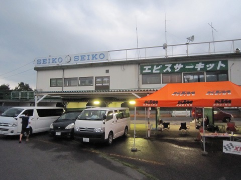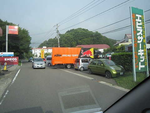 7:00 エビスに到着 二本松インターを下りて、セブンイレブンで朝食と飲物を調達。 インター近くにあるJAのスタンドが開くまで待って、携行缶にガソリンを調達して、エビスサーキットまで上がってきました。 ゲートオープンはまだみたいで、入り口にはゲートオープンを待つ車が列をつくっています。 今回はKTMのトラックもきてますね。 |