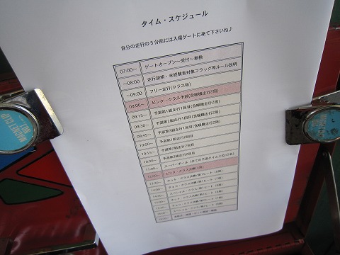 8:54 タイムスケジュール 配られたタイムスケジュールを見ると、 午前中、15分2回の予選(?)。 お昼には”スーパーポール”(?)。 午後は8周のレースが2ヒート(?)。 走行会と言うより、草レースでした。(^_^;) だから、ホットチョコ”カップ”なのね。(笑) |