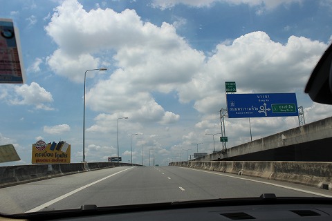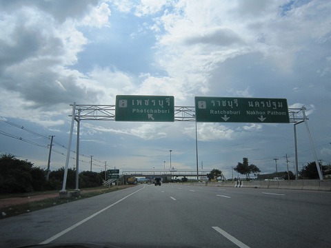 12:35 晴天 バンコク市内で高速に上がり、西走して標識にあるペッチャブリの街を目指します。 ホアヒンはバンコクの南西およそ200キロに位置し、タイ湾をのぞみます。 雨期のあるタイで、今は雨期の終わり頃。 今日はそれに雲があるものの晴天です。 |