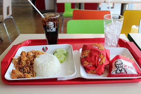 13:28 遅めの ここでお腹が空いたので、ちょっと遅めの昼食。 ホアヒンに着けば美味しい海鮮料理を食べることができるので、ここは軽めに。 入ったのはケンタッキーフライドチキン。 わざわざタイまで来てKFC、と思うかもしれませんが、タイの人はチキンの料理が大好き。 で、結構いろんな場所にあって、マクドナルドなんかより圧倒的に目にする店舗数は多いです。 そして、注文は自分はホットチキンサンドのセット。 嫁さんは、ご飯のセットなんだけど、辛口のチキンは何て言うかわからない。 日本には無いオリジナルな料理が結構あります。 もちろん、どちらも結構な辛さです。(笑) |