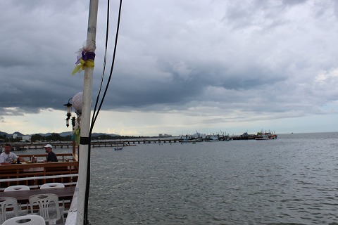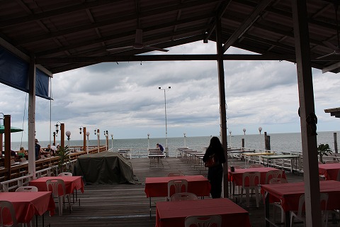 16:36 海に突き出たオープンテラスのレストランは、せっかくなのに天気がイマイチ。 途中から、雨がパラパラと落ちてきて、屋根のあるところまで移動。 |