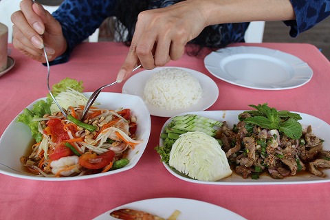 20:34 並んだね いや〜。 並んだね。 頼みすぎだ! (汗) と言うか、一品ずつの量が多いね。 トムヤムなんて完全に4杯以上入っているファミリーサイズだ。 ホアヒンが都会のバンコクに比べると量が多いのは、日本でも田舎に行くと量が多いのと同じだね。 |