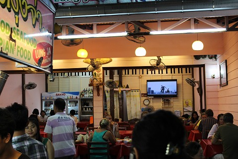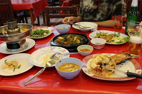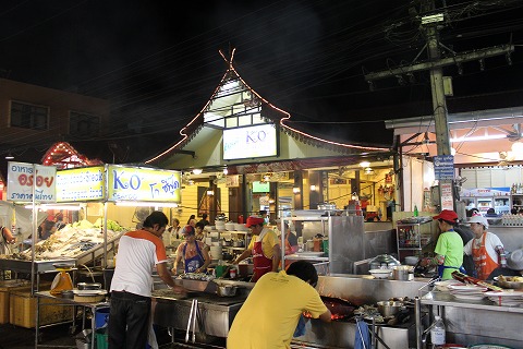 20:03 レストランへ マーケットの中程まで歩くと、食事を出す店が数軒見えてきます。 ナイトマーケットが行われている通りは、その時間車は通行止めで歩行者天国になっています。 レストランは店先に魚や貝、エビにカニを並べ、屋外で焼き物や炒め物の調理をしています。 その調理の臭いが、たまらず食欲をそそりますね。 |