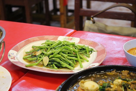 20:27 空芯菜 で、野菜が不足してるので空芯菜の炒め物。 もともと中華料理だとろうけど、タイのレストランでもほとんど見かけます。 ガーリックとオイスターソースの定番の味付け。 |