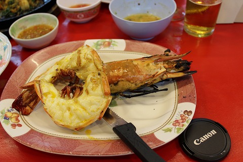 20:31 エビ そして、最後に店に入る前に選んだエビが焼かれて出てきました。 エビは1kgで1,000THB。 このエビは400THBだったので400グラム。 全長で30cmくらいありました。 これで約1,000はお安いね。 やっぱりタイに来たら1回くらい食べないとね。 |