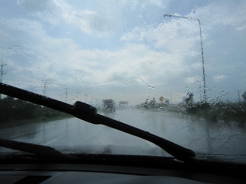 14:12 スコール そして、ホアヒンに向け走っていると突然のスコール。 向こうの空は晴れているのに、真上にある雲から容赦なく大粒の雨が落ちてきました。 ワイパーを最速にしていても視界が遮られ、必然的に走行スピードはダウン。 |
