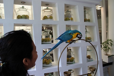 レストランのエントランス脇にはAnantaraホテルのアイドル、オウムのALEX、26歳。