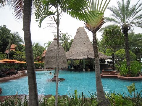 9:39 朝食へ 朝の散歩から1時間、朝食をやっているレストランが10時半までなので、嫁さんを起こして朝食を食べに行くことにします。 部屋を出て、レストランに行くまでの道すがら、さっき通ったプールサイドを歩いていくと、何人かのお客さんがプールを楽しんでいました。 広いプールにまばらな人、優雅だね。 |