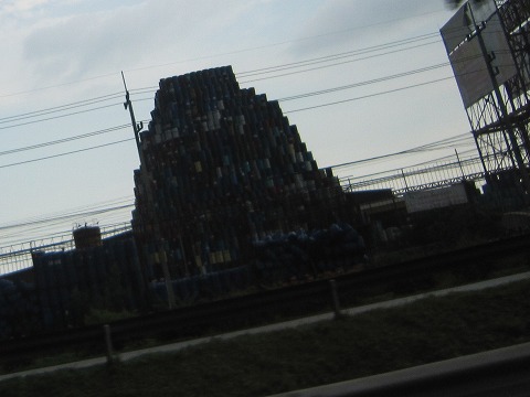 ドラム缶 よく見ると、ドラム缶! 積み上げられている高さが半端じゃない。(汗) どうやって積み上げたの? そして、崩れないのか? |