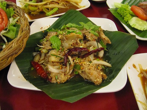 21:00 店は流行っていて、1階と2階のフロアーはお客さんで一杯。 しばらくして、ソムタムとガヤーンそして、ビア・シンハーが運ばれてきました。 ソムタムは赤トウガラシ・青トウガラシが日本人の自分からすると考えられないぐらい入っていて、強烈に辛い! (>_<) でも、旨い。(^o^) ビア・シンハーがすすみます。 ”ガヤーン”は自分の耳には”ガヤーン”と聞こえるし、そう発音すれば通じるんだけど、正確には”ガイ・ヤーン” ”ガイ”は鶏肉で、”ヤーン”は調理方法で”焼いた”の意味、なので単純に”焼き鳥”のこと。 ガヤーンは、肉に醤油ベースの下味が付けてあって香ばしくて美味い。 ソムタムもガヤーンも元々はタイの東北部イサーン地方の食べ物らしい。 |