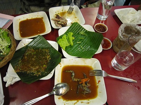 21:26 完食 バクバク食べて、辛さで汗が噴き出す中、完食! ソムタムの旨さは、皿に残ったカニの足にあります。 ソムタムのタレを作るときに、たぶん生のカニを丸ごと石臼で叩き潰して入れてあります。 このカニの旨味が、ソムタムの秘密だね。 けど、生のカニなので「食中毒大丈夫か?」と思うけど、たくさんの人が食べてるし、トウガラシの強烈な辛味がきっと殺菌作用があるんだ。と言い聞かせて食べてます。(笑) でも、今ウィキってみたら、”生のカニには寄生虫(ジストマ)がいる場合があるので注意が必要である。”と書いてあった。(汗) 『もう、食べちゃったもん。 しかもこのレポを書いているのは、3ヶ月も経った12月25日。(滝汗) ご馳走様でした。 <(_ _)> 本日はこれまでです。 |