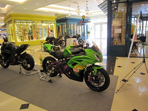 11:39 バイクブーム感 今日は色々な手続きがあり、役所に行く予定ですが、やっぱりバンコクで移動すると渋滞で時間が読めません。 昼前になったので、朝食を食べていない嫁さんがお腹を空かせて機嫌が悪くなりそうなので先に昼食を食べることにします。 (ちなみに、自分は朝一人で起きて、昨日スーパーで買った菓子パンと野菜ジュースで朝食をすませました。) そして、自分にはどこだかわかりませんが、どこかのショッピングセンターへ。 ショッピングセンターの中では、写真にあるようにバイクが展示されていました。(写真は展示されているバイクのほんの一部) 今までタイではオートバイと言えば、日常生活に使用する小排気量のアンダーボーン(スパーカブみたいなバイク)のバイクが主流でした。 ここ最近は、タイでもホンダがCBR250などを製造していることもあり、排気量も250cc以上のスポーツタイプのバイクがブームになりつつ感がありますね。 |