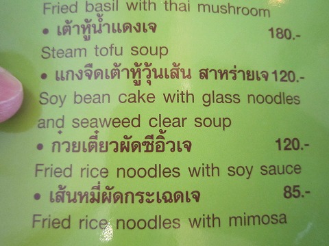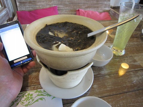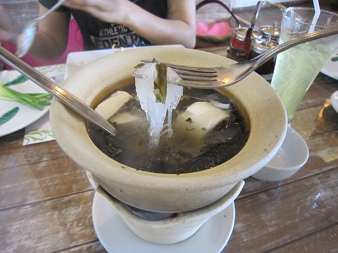 11:56 昼食は ホアヒン滞在中はどうみても食べ過ぎたので、バンコクに帰ってきてからは抑え気味に。( ̄。 ̄;) 3時間ほど前に朝食を食べたこともあるので、軽くと思い。 どんな料理が出てくるかわかりませんが、”Soy bean cake with glass noodles・・・・”と書いてある料理を頼みました。 ソイビーンケーキは豆腐のことなので、豆腐の入ったラーメンか何かかと期待しましたが、出てきたのがこれ! (汗) 豆腐の入った海草スープ! 『ヘルシーすぎるぜ! (汗)』 |