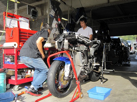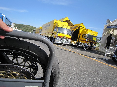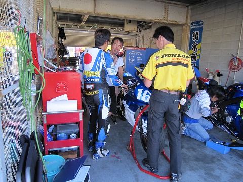 6:59 ピットへ ピットに到着すると、すでにバイクは準備完了。 タイヤウォーマーも巻いてあるし、 『オラの仕事がねえずら。』 |