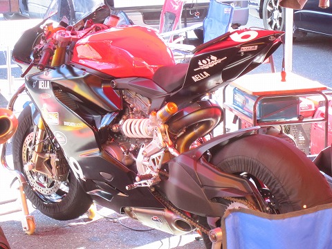 10:27 パニガーレ DUNLOPさんでタイヤを交換してもらってピットに戻ると、ピット裏には見慣れぬバイク。 今回全日本と併催して行われるイベントレース、キング オブ ユーロファイターに出場するマシンです。 ユーロファイターは読んで字のごとく、ヨーロッパ製のバイクのみ参加できるレースです。 細かいレギュレーションはわかりません。(笑) で、マシンはDUCATIをはじめとして、BMW、KTMとかapriliaとかが参加してました。 そして、このマシンはドカのニューモデル、パニガーレ! (@_@) 足下から吐き出されるエグゾーストが格好いい! で、普通のスポーツバイクだとリヤサスがある部分にエキパイ? 『リヤサスが無い!』 (゜o゜;) |