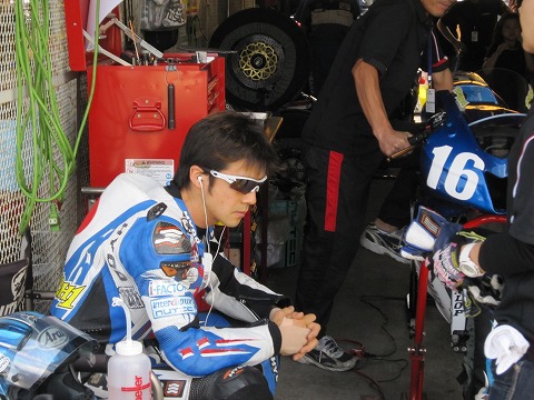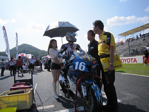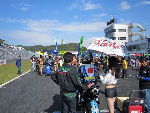 11:00 グリッドに 10時50分から決勝のスタート進行が始まり、ピットアウト。 1周のサイティングラップを行い、グリッドに付きました。 ここで、DUNLOPさん、メカの清水さんと最終確認。 |