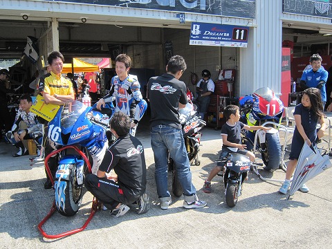 11:44 レース終了 レース終了後、すぐに11時50分からピットウォークの時間です。 ピットにバイクを戻すことなく、そのままピットロードにマシンを並べます。 |