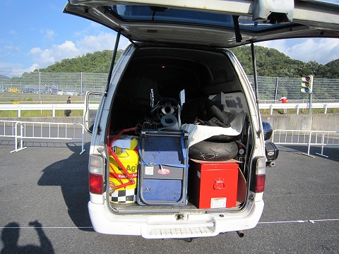 15:30 撤収 レースが終わり、昼食もおわり、撤収の準備。。 残っているJ-GP2やJSBのレースを見ながらで、積み混みが終わったのがこの時間。 メカの清水さんのハイエースは結構荷物満載だ。 |