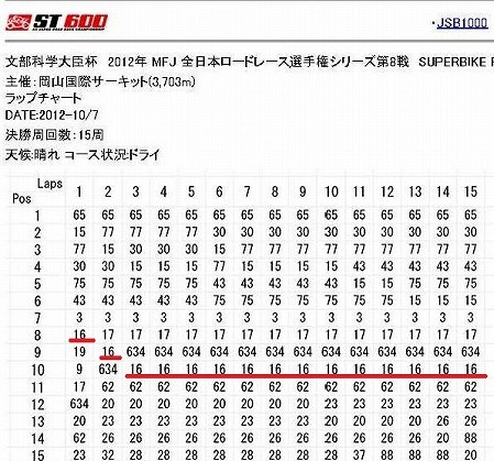 8:25-8:40 ウォーミングアップラン 8時25分からウォーミングアップラン(朝のフリー走行)が開始になりました。 朝フリーは、レギュレーション上、全ライダー昨日の予選に使ったタイヤで走行しています。 昨日の予選で40分間走ったタイヤで、しかも朝が早いこともあり路面温度も低め、決勝前無理もできないので、各ライダーはマージンを取って予選に向けてのバイクの仕上がりを確認します。 ここで、1番時計は稲垣選手。 昨日の予選に引き続き、今日も9周回した中の8周目、後半にタイムを出しています。 ちょっと不思議ですね。 そして、國川選手はHARCの小林龍太選手がポジションアップし、11番手のタイム。 |