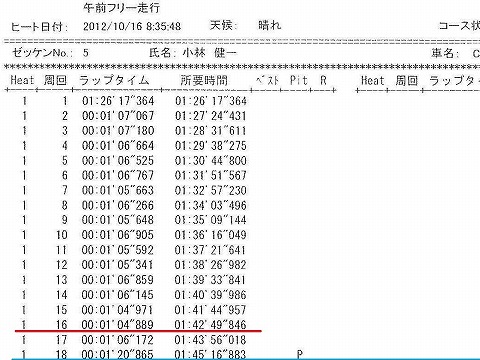 | 14:30-14:46 写真を撮ったりして45分ほど休憩して、午後2本目の走行。 アイスエイジさんと一緒にコースイン。 最初は自分が先行。 そして、途中でアイスエイジさんに刺され、今度は自分が後追い。 なかなか追いつかず、結局捕まえることができなかった。 同じ条件で走ったら、まだアイスエイジさんの方が速いじゃないかい。 |